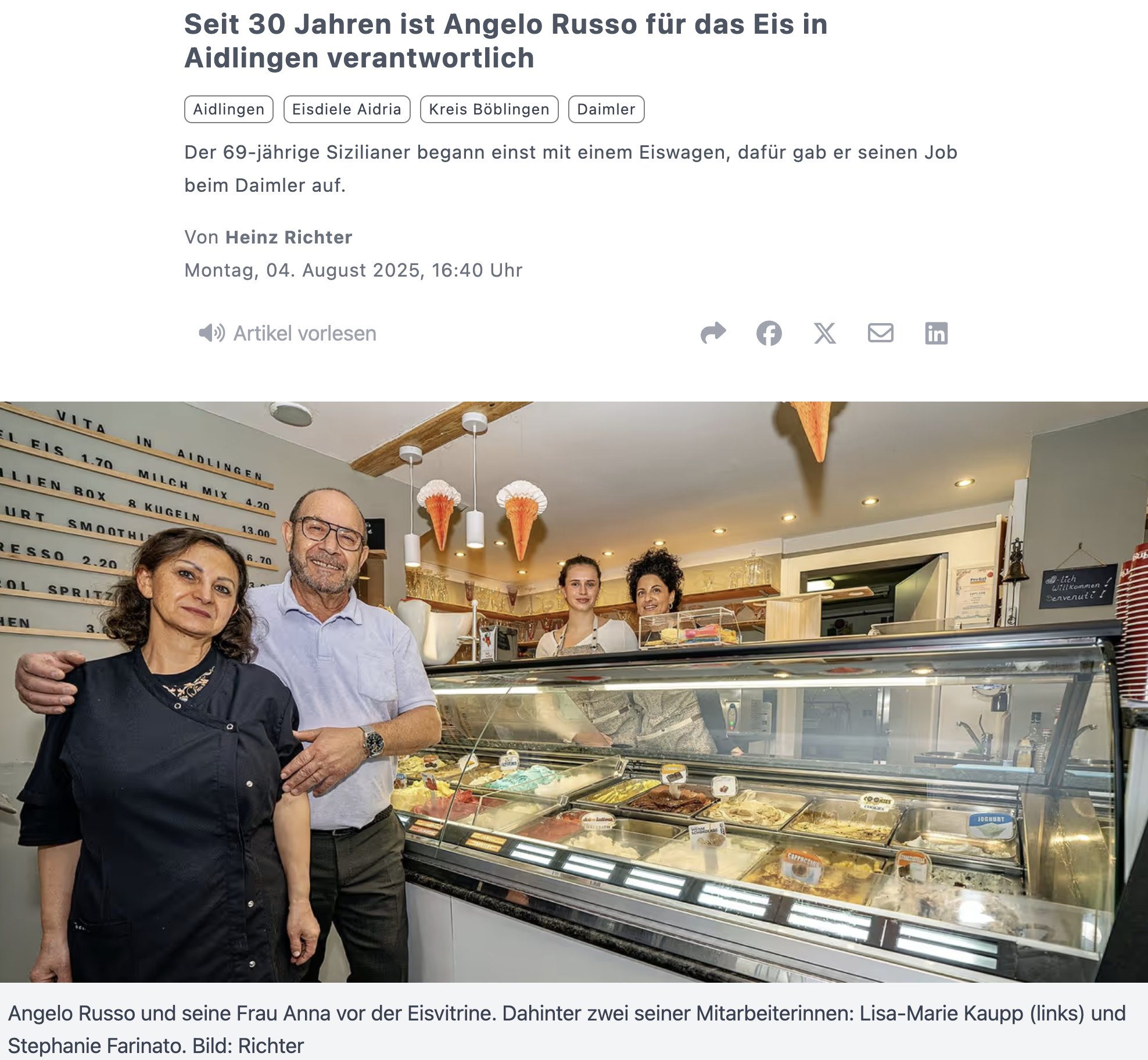 Sindelfinger Zeitung: “ 300 Gäste beim Jubiläum - Seit 30 Jahren ist Angelo Russo für das Eis in Aidlingen verantwortlich”